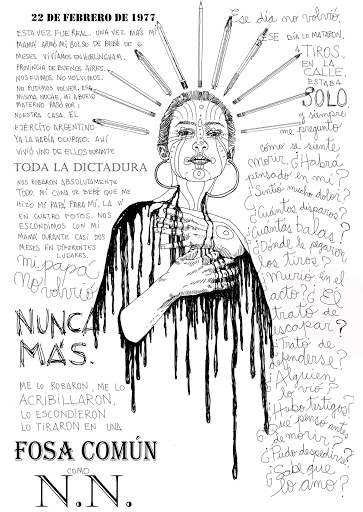 Atendiendo paralelismos antojadizos, La niña… por momentos parece un comic godardiano; aborda temas sociopolíticos apuntando al hueso, al mismo tiempo que los presenta de una manera rupturista (sin abandonar del todo el concepto secuencial de la historieta, Giuffra inclina la balanza del relato hacia el impacto más típico de la ilustración, prescindiendo en más de un momento de las grillas clásicas de viñetas; maneja cantidades ingentes de texto, escrito a mano, alternando entre diversas tipografías y tamaños, y utiliza titulares de diarios en collage, entre otros elementos). Y hablando de ilustración, ya desde la tapa se percibe la c(u)alidad académica del dibujo –lógicamente apoyado en referencia fotográfica, sí, pero sin recostarse en la mímesis literal- que sin dudas va a captar la atención de cualquiera que lo tenga en sus manos. Lo que no cuenta su propia historia es contada por otros, o peor aún, no contada en absoluto.
