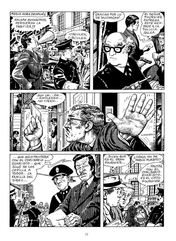 Ese deseo de policial hecho por y sobre argentinos se hace realidad para Sasturain en las páginas de Superhumor, cuando éste ya no era jefe de redacción, pero prosigue su recorrido en la siguiente publicación que sí lo tendría como jefe de redactores, una tal Fierro: estamos hablando de Evaristo de Carlos Sampayo y Francisco Solano López, sin duda alguna uno de los tótems definitivos de toda la historia de la historieta argentina. Los dieciséis episodios de la serie completa que recoge la edición de Hotel de las Ideas siguen los pasos de Evaristo Meneses, figura de la vida real y jefe de Robos y Hurtos de la Policía Federal entre 1957 y 1962. Aquí tampoco es la figura de Meneses el centro de atención de la historia, pese al lacónico sentido del humor del que lo dota Sampayo y las excursiones que hace por su vida privada; o quizás lo correcto sería preguntarse si hay un centro exclusivo de la historia. Sí hay algunas nociones claras a las cuales aferrarse, articuladas perfectamente a través del montaje de viñetas y la puesta en página de Solano: hay algo de construcción comunitaria del sentido en Evaristo, y se ve tanto en las habladurías cotidianas–viñetas de gente comentando los avatares del caso de la historia, en algunos casos completándose el enunciado/frase con el diálogo pasando de una viñeta a otra (y protagonista) como si fuera una pelota de fútbol- como en el fuego mediático –los titulares en la calle del diario Los Sucesos y el detrás de escena de la redacción, con su explotación del filón sensacionalista para generar más ventas-.