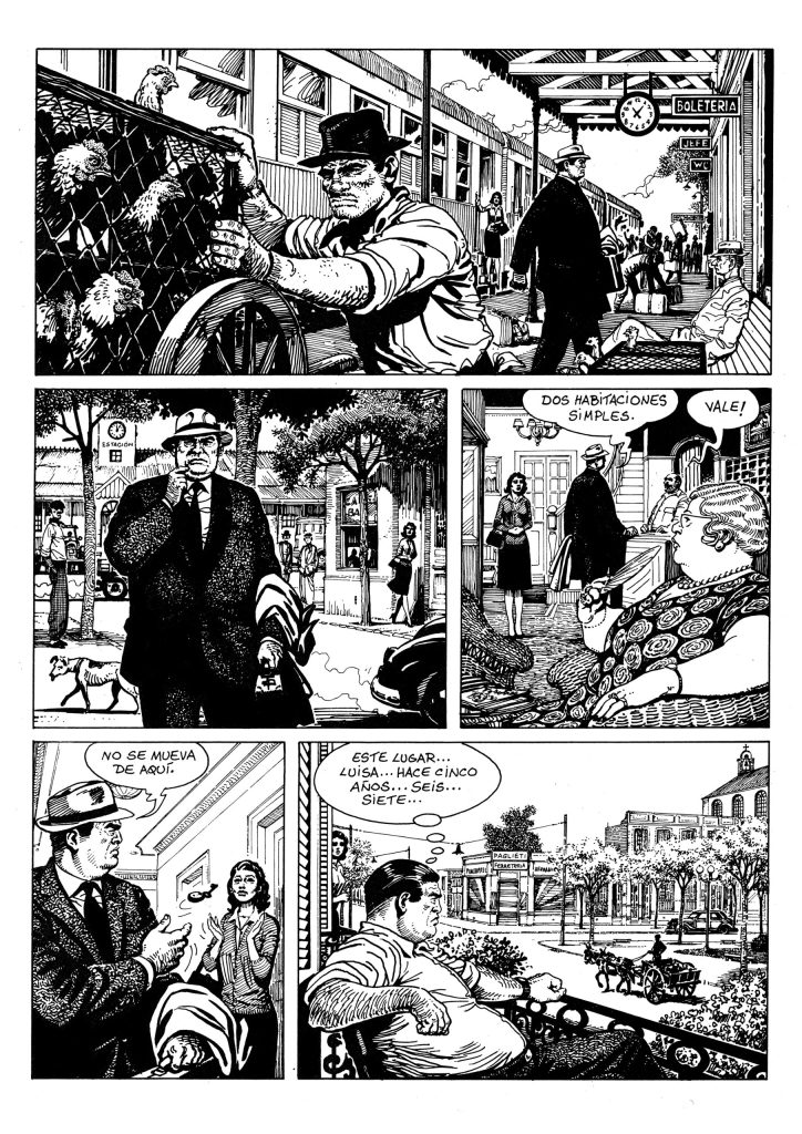 Sasturain no encuentra en su artículo muchas virtudes en Precinto 56, pero este es un buen momento como cualquier otro para revisar lecturas. La serie nace en los 60’s de una idea del guionista Ray Collins (basando su enfoque en la serie de TV Naked City) dibujada en aquel entonces por un joven José Muñoz; de allí en más tuvo varias etapas hasta entrados los 90’s inclusive, pero la época considerada como clásica es aquella realizada a mediados de los 70’s con dibujos de Ángel ‘Lito’ Fernández, cuyos seis primeros episodios recopila este libro editado por Doedytores. El teniente del consabido precinto es Zero Galván, un chicano que no recibe un tratamiento pormenorizado en la construcción de su psicología, puesto que el enfoque de Collins no hace mucho hincapié más que en su soledad crónica y la actitud desaprensiva de reconocer sus propios límites ante la superestructura de corrupción y decadencia -policial y no tanto-, quedándose piola y encendiendo un faso para despistar. Galván actúa más como vehículo para las historias de aquellos que se cayeron (o buscan salirse) del sistema, yendo de excombatientes de Vietnam a jóvenes ABC-1 devenidas hippies, pasando por pordioseros y otros desesperados. Lo particular de Precinto frente a otros policiales de esos años (vale pensar por ejemplo en el cine del New Hollywood) es su interés por no solo nombrar al perro sino también al dueño; si detrás de la corrupción no se esconde un esquema preciso, al menos hay un motor, y los diálogos explicitan la potencia mecánica del metálico (“El mundo es sexo, dinero, sexo otra vez”, “Aquel mundo olía a podrido pero el dinero lo hacía respetable”) o inclusive de la política exterior de EE UU (“un americano es ciudadano en todas las guerras”), enfoques que podrían ser considerados inusuales de llevar la firma de un estadounidense.