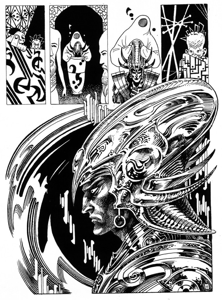 En su metier, el costado gráfico/narrativo, Enrique Alcatena actúa como un bibliotecario: elige volúmenes de cada estante para erigir su edificación. Y su torre es variopinta, mas no incongruente: las arquitecturas a lo Philip Craig Russell, el diseño de Hark a lo Kevin O’Neill, el blanco/negro molecular de Lucho Olivera, destellos de Mike Kaluta o Barry Windsor Smith. Y eso ciñéndose al ámbito del comic, porque también abreva en las clásicas estampas japones, la Secesión Vienesa de Klimt, o el decadentismo inglés (bastante hay de Aubrey Beardsley en el personaje de Sibilina, por ejemplo). La puesta en página oscila muy utilitariamente entre la locomoción desbocada de las páginas de acción, y el carácter más bidimensional, cercano a la ilustración, de las influencias no historietísticas.