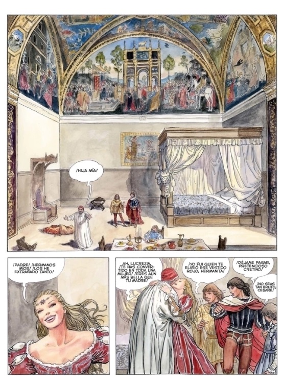 Borgia no se trata tanto de un racconto histórico lineal preciso -por más que hagan cameos Da Vinci, Botticelli y siga una clara línea cronológica-, como de un amplio telón que sirva de marco referencial para la exhibición del despliegue de una organización criminal-familiar: ahí es donde se pueden insertar sin problemas las comparaciones con Corleones, Sopranos o Puccios. Y es donde se halla una de las claves de la historieta: el delirio/carácter visionario/megalomanía del cardenal -luego Papa Alejandro VI- Rodrigo Borgia, el pater familias, vislumbra la erección -sí- de un imperio a través de la consolidación del vínculo familiar con sus hijos. De la manera que haga falta: haciendo coger a los hermanos entre sí (¿esto, de dónde me suena?), disgregándolos cuando sea necesario, obligándolos a contraer matrimonios de cartón para anexar territorios, medios para un fin**.