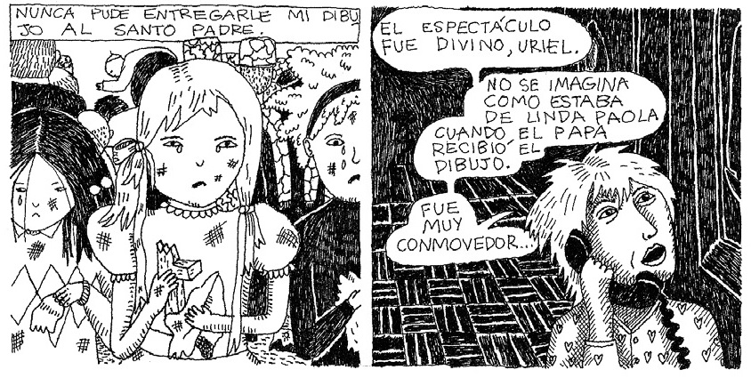 En esa escena inicial de la fecundación (!) con un zoom out que termina llevando a las calles de Quito, o en las viñetas que contradicen la información visual o verbal del cuadrito que las precedió, ya se puede apreciar un más que interesante entendimiento de la narrativa, por lo general estructurada en una grilla de cinco o (más seguido) seis viñetas. Difícil que no llame la atención el apartado estético, por la transgresión de casi todas sus normas académicas básicas: perspectiva, bidimensionalidad, proporciones del cuerpo humano. Al mismo tiempo, hilando más fino, esta historia no podría estar dibujada de otra manera (sea por Powerpaola misma o por otro dibujante): ese trazo liendre no puede estar disociado del contenido del relato, su unidad como obra. Esa intersección de torpeza y candidez en el dibujo es la misma que habita en el núcleo de la historieta.
