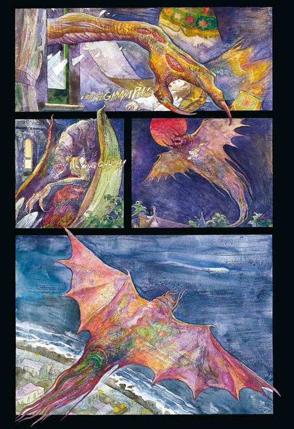 Y en algún momento de la historia el estilo visual de Enrique Breccia integra los dos registros gráficos preponderantes: las acuarelas correspondientes a las escenas de alucinaciones, el trabajo con pluma y color directo para el plano más terrenal, en el cual el volumen lo da mayormente el trabajo de líneas, al estilo de un grabador. Ese momento de la historia es la preparación para el enfrentamiento, o mejor dicho confrontación, en el cual pasa a una impronta basada en pasteles -para finalmente volver a la pluma, tras el restablecimiento del status quo-. El imaginario lovecraftiano ha tenido cotas altas en la historia del comic -Corben, Wrightson, su propio padre Alberto-, y sin dudas por prepotencia de laburo -e imaginación, observen esa paleta cromática refulgente cuando la alucinación entra en la realidad-, Churrique se abrió paso para meterse directo en ese panteón con su labor en Lovecraft.