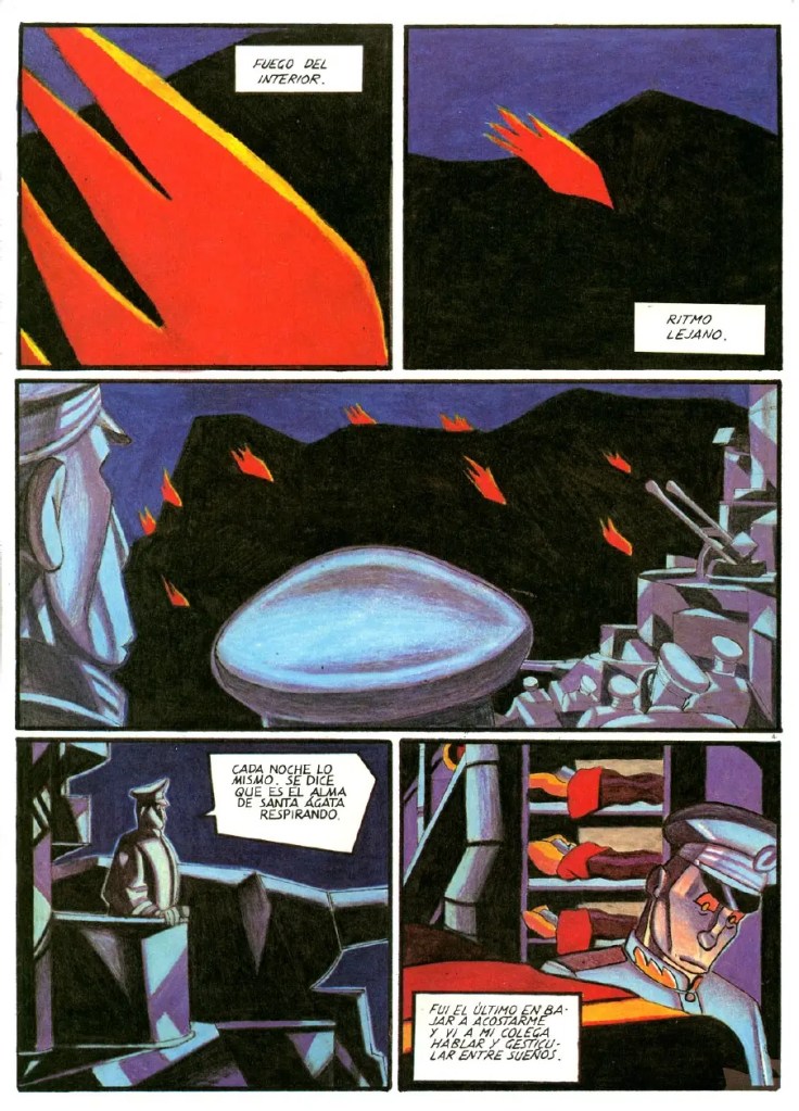 1986, fecha de publicación de Fuegos (Fuocchi en el original), halla a Lorenzo Mattotti con un buen kilometraje artístico dentro del Gruppo Valvoline (que también supieron integrar, entre otros, su coequiper guionista Jerry Kramsky, Igort, Charles Burns o Massimo Mattioli), una agrupación de historietistas con vocación marcadamente experimental, y ya con una obra propia como autor integral, Incidenti. Es famoso el texto de contratapa que figura en la edición española de Fuegos de La Cúpula, de 1988: “No había sido capaz de atrapar la naturaleza en mis trabajos anteriores… He querido comunicar mi fascinación por la naturaleza. Cuando ves una película de Tarkovski o Herzog – el verde, el follaje, las nubes -, es increíble. ¿Cómo se pueden expresar esas cosas en un cómic? ¿Es posible? Este fue el desafío” es la elocuente declaración de Mattotti, respecto del espíritu de su segundo opus.