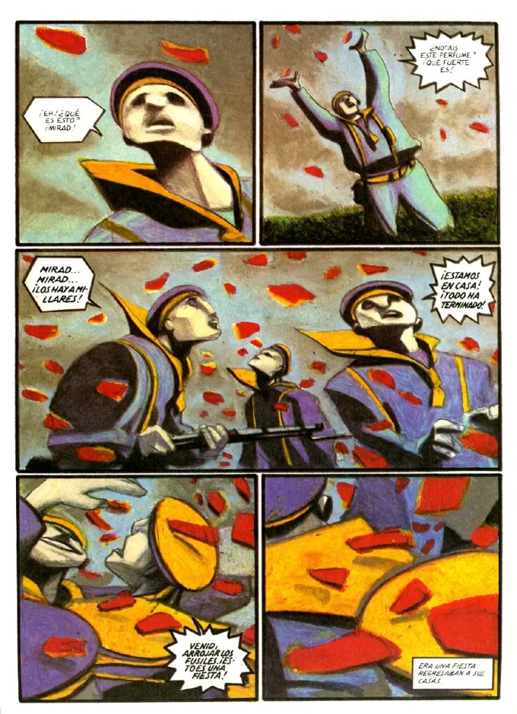De alguna manera, la novela gráfica funciona bien a la manera de una película. Su potencia está más en el encadenamiento de los hechos, ergo, la trama (el desahucio de estos pobres despojos humanos, que solo pueden trasladar su condición de monedas vivientes al yugo de nuevos amos y/o escenarios), que, en lo verdaderamente enunciado, o sea el guion. No hay énfasis en diálogos (o bloques de texto) de reflexión (o abstracción) sobre los hechos, es la misma madeja de acontecimientos la que forma el cuadro mayor en la mente del lector.