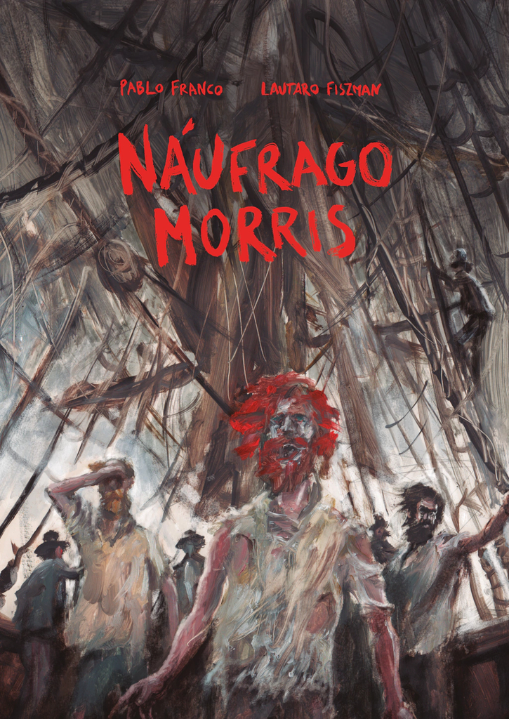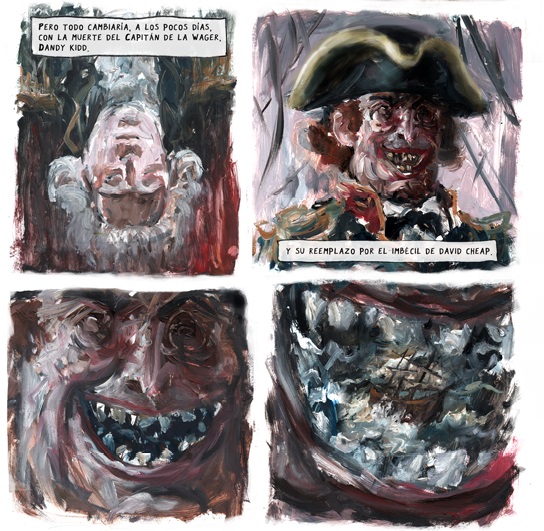 Náufrago…, coeditada por Historieteca y Loco Rabia en Argentina, 2023, es un relato ficcional armado a base de escritos, diarios y testimonios -del propio Isaac Morris y otros marinos- de la época en la cual está situada la historia, esto es, el siglo XVIII. Entonces, donde las derivas y los itinerarios obedecen a hechos fidedignos -o seamos buenos: posibles o verosímiles, si hablamos de relatos para la posteridad-, es función de la historieta ir un pasito más allá, si no se busca el dar documento literal y pedagógico. De esta manera, asoman su cabeza la geopolítica, con el choque entre imperialismos (Inglaterra y España), o el elemento social de los expedicionarios (buscas en el mejor de los casos, rapaces en el más probable de los casos).