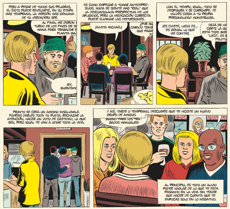 A la hora de hablar del terreno estético y narrativo, Clowes manda a todos los jugadores a la cancha. Dibujada en un estilo en iguales partes caricaturista y realista -eso significa que cada personaje va a tener su propia cara-, con colores bien estridentes -en especial los amarillos-, el estadounidense maneja grillas de viñetas bastante convencionales, para darle vueltas de tuerca en la relación entre uno y otro cuadrito (su ajustadísimo uso del montaje, las elipsis), y al interior de ellos: tensiones irónicas entre la “voz en off” del texto y la imagen, y el truco de globos de diálogo que “pisan” a otros y quedan fuera del campo de visión del lector -una materialización visual de una sustancia sonora-, como un diálogo de la vida real. Como la vida real, sí, el autor de Ghost World dio a luz una novela total posmoderna (él mismo acredita influencias del Ulises de Joyce), un edificio caótico y coherente, habitable e intolerable en igual medida.